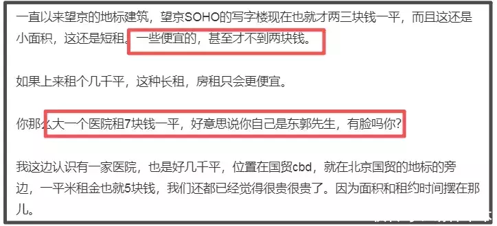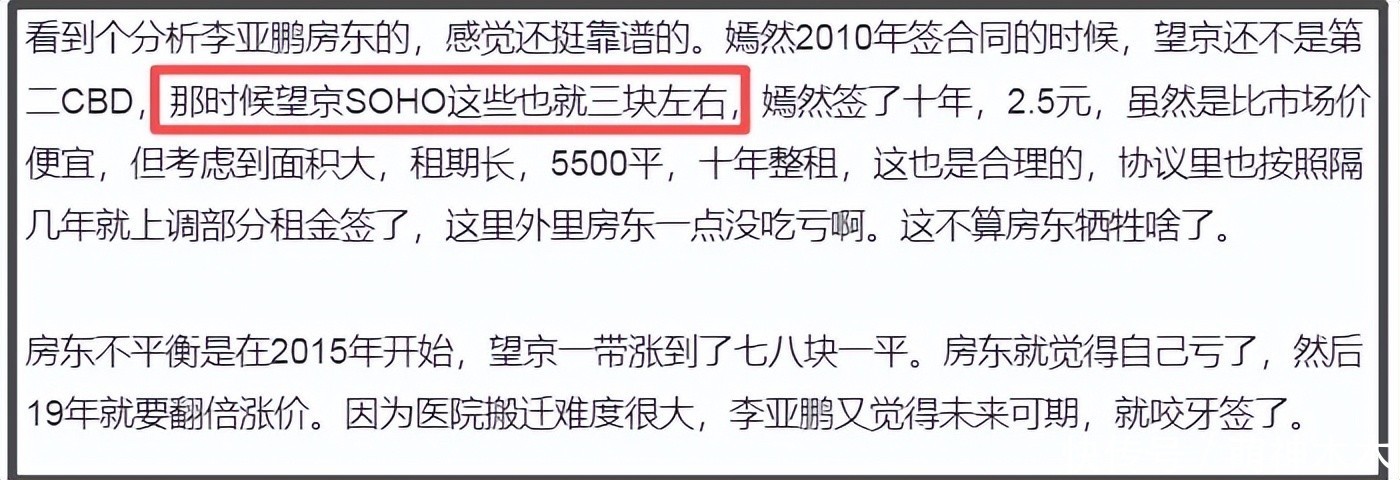 许多在同地区租公司且从事相关医疗行业的人士认为房东的说法并非事实,他们称2019年是那片地区的房价顶点,租金才七八块钱,而在之前的十多年还算偏远郊区,租金三块钱合理,且像医院这样几千平米且10年一租的租金,本身内部也会有折扣,所以李亚鹏自始至终并没有赚到便宜。这也是为何即便房东强调“市场价格”大众不买账的由头。