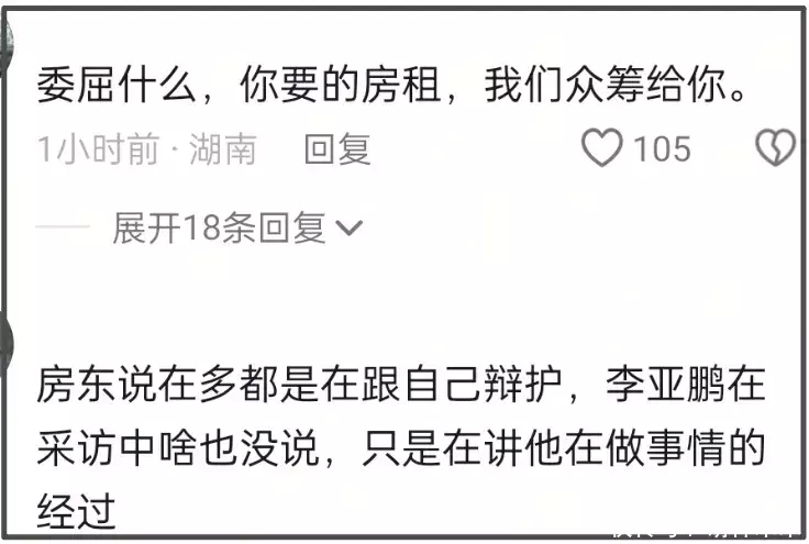 不少网友看到相关信息仍然表示房东格局不够大,不知道在委屈什么,毕竟李亚鹏只是陈述事情发展经过,并没有说房东的不是。还有一些网友吐槽房东这波臭了自己的口碑,大楼可能很难租出去了。